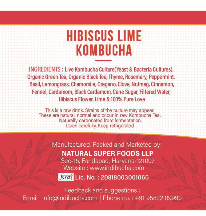 Live Kombucha Culture (Yeast & Bacteria), Organic Green Tea, Organic Black Tea, Thyme, Rosemary, Peppermint, Basil, Lemongrass, Chamomile, Oregano, Clove, Nutmeg, Cinnamon, Fennel, Cardamom, Black Cardamom, Cane Sugar, Filtered Water, Hibiscus Flowers, Lime and 100% Pure Love.