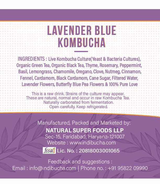 Live Kombucha Culture (Yeast & Bacteria), Organic Green Tea, Organic Black Tea, Thyme, Rosemary, Peppermint, Basil, Lemongrass, Chamomile, Oregano, Clove, Nutmeg, Cinnamon, Fennel, Cardamom, Black Cardamom, Cane Sugar, Filtered Water, Lavender Flowers, Butterfly Blue Pea Flowers and 100% Pure Love.