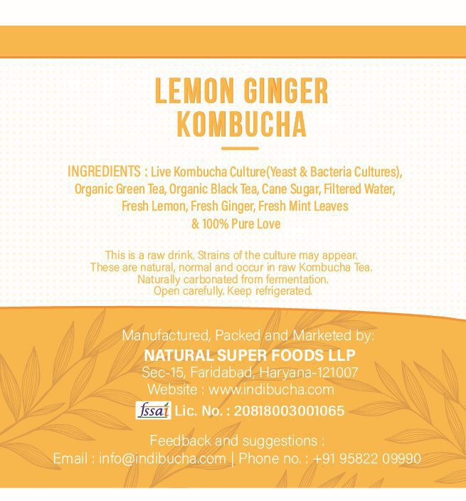 Live Kombucha Culture (Yeast & Bacteria), Organic Green Tea, Organic Black Tea, Fresh Lemon, Fresh Ginger, Fresh Mint Leaves, Cane Sugar, Filtered Water and 100% Pure Love.